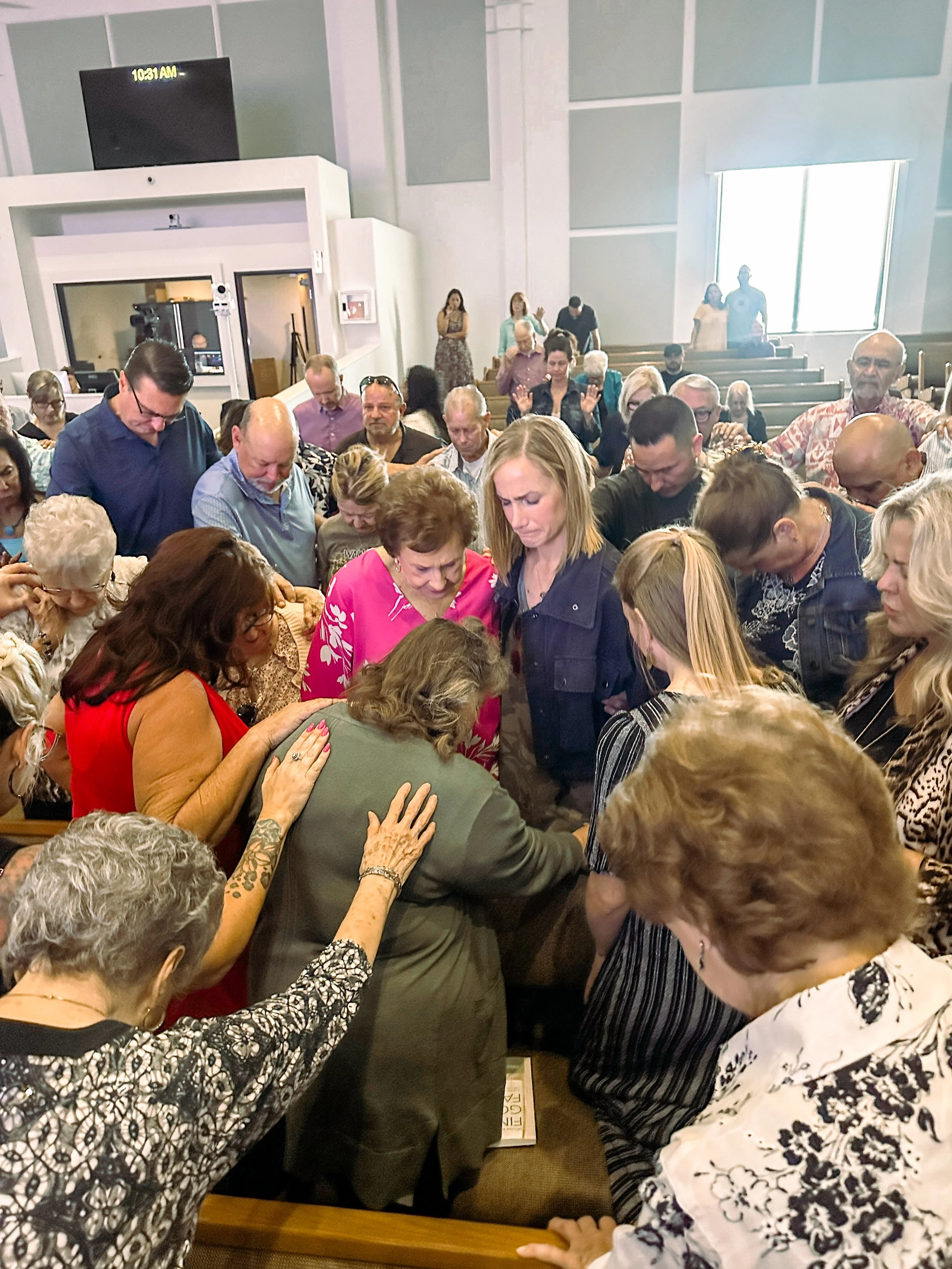 And so, in the days leading up to surgery, we began to feel the embrace. Our epic VC Neighbors jumping on a Meal Train to make sure we would be well fed, friends rallying to help with childcare, rides, baseball games, and more (shoutout Vanessa Campbell, the "Swiss Army Mom," you rule and we couldn't do this without you!), our wonderful elementary school community rallying for prayers, door dash gift cards, and sending beautiful flowers, family members pushing pause on their entire lives to help in every conceivable way, and, of course, our wonderful church family at Bridge Community Church who is the background note of this all, holding us in prayer 24/7. The day before Natalie's surgery, our senior pastor invited our church to pray for Natalie, but not just passively from a distance. Natalie was invited to join our dear friend, Peggy, who proudly told me a few weeks ago, had "outlived the 6 months to live" her doctors gave her over 7 months ago, following a nasty cancer diagnosis. The image of this wonderful, godly woman, embracing my wife in her own pain as they prayed together, with the church gathered around them in support, was too much for a softy like me: I shed some tears (and snapped a picture, too).